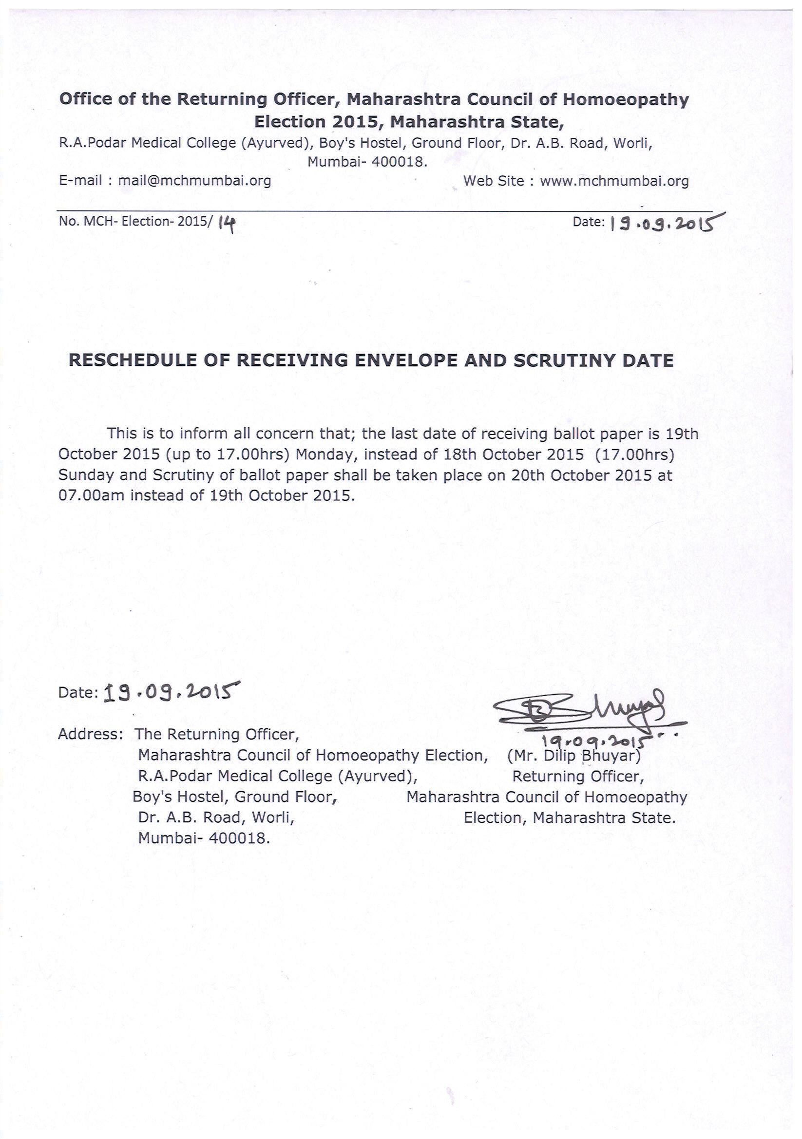 9 19/09/2015 RESCHEDULE OF RECEIVING ENVELOPE AND SCRUTINY DATE